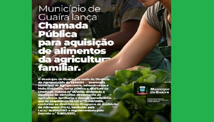 O Município de Guaíra, por meio da Diretoria de Agropecuária da SEMAIM — Secretaria Municipal de Agropecuária, Infraestrutura e Meio Ambiente, torna pública a abertura da Chamada Pública n.º 01/2025, destinada à aquisição de alimentos diretamente de agricultores familiares e demais beneficiários que se enquadrem na Lei n.º 11.326/2006, conforme as diretrizes do Programa de Aquisição de Alimentos (PAA), instituído pela Lei n.º 14.628/2023 e regulamentado pelo Decreto n.º 11.802/2023.