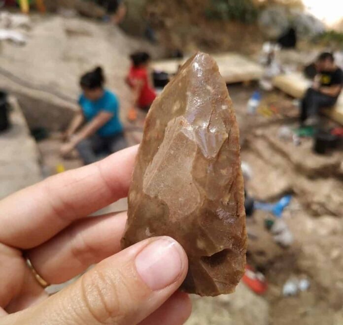 Artefato lítico da Caverna Tinshemet feito com tecnologia compartilhada pelo Homo sapiens e Neandertais. (Imagem: Marion Prévost)