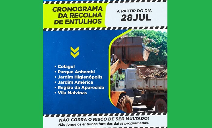 O Município de Guaíra destaca a orientação para que os moradores dos bairros atendidos coloquem os entulhos nas calçadas somente nos dias que antecedem a passagem da equipe de coleta. Móveis velhos, restos de construção, galhos e materiais inservíveis devem ser dispostos de forma organizada, facilitando o trabalho das equipes.