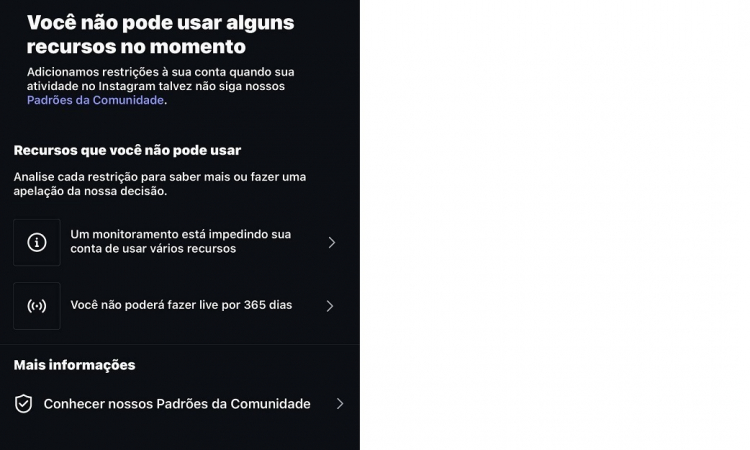 Além da exclusão do vídeo, a atriz relatou ter perdido acesso a outras funcionalidades da rede social. Revoltada, ela criticou o critério adotado pelo Instagram para moderar conteúdos. “Homens sendo misóginos, assediando, discursos de ódio, vocês não excluem e nem bloqueiam, né? Denuncio 400 vezes publicações horrorosas e nada acontece”, escreveu.