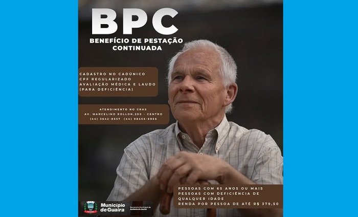 O Município de Guaíra por intermédio da Secretaria Municipal de Assistência Social (SEMAS), por meio do Centro de Referência de Assistência Social (CRAS), informa que pessoas com 65 anos ou mais, ou com deficiência de qualquer idade, podem ter direito ao Benefício de Prestação Continuada (BPC). O benefício garante o pagamento mensal de um salário mínimo, mesmo para quem nunca contribuiu com a Previdência Social.