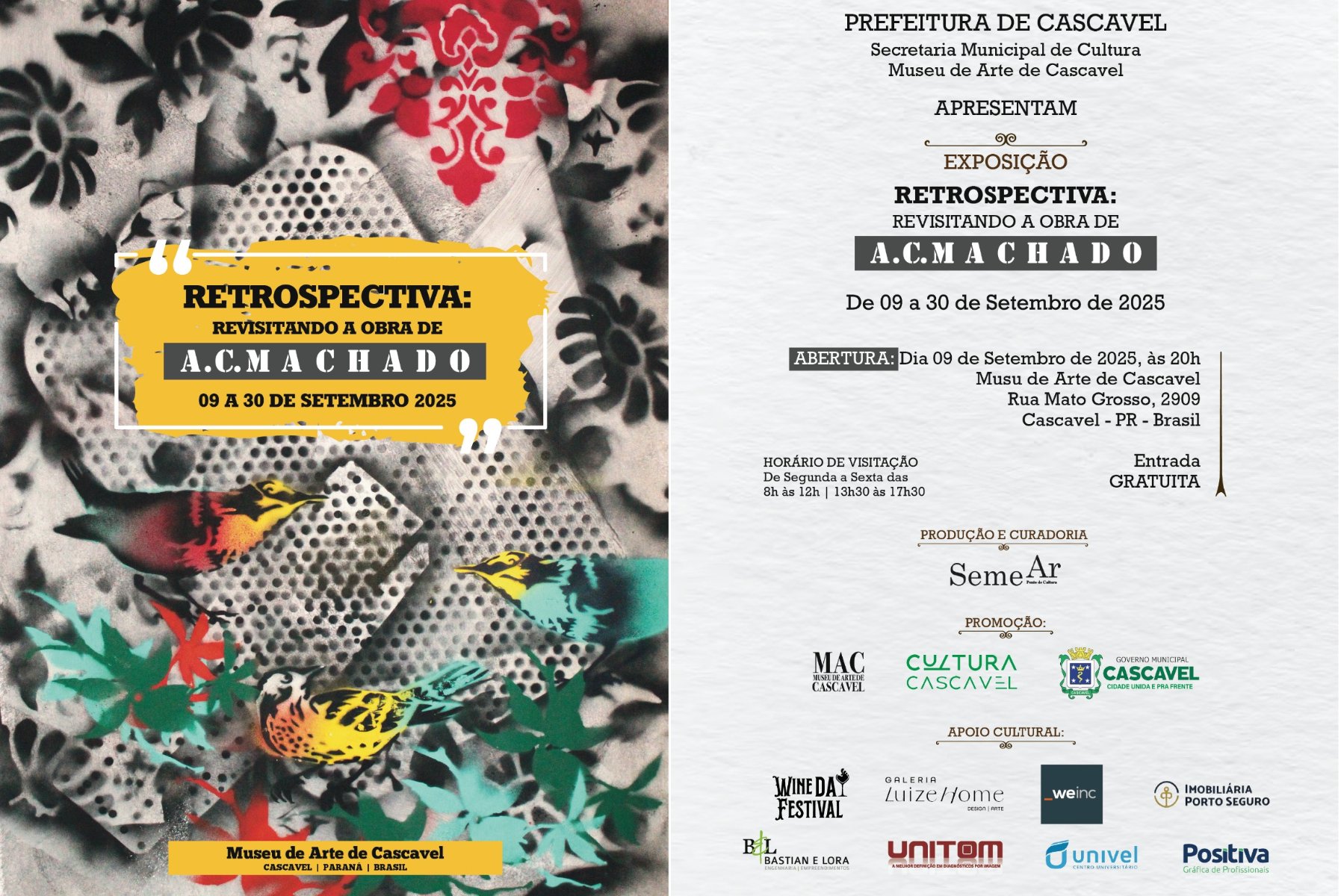 O Museu de Arte de Cascavel tem a honra de anunciar a abertura da exposição “Retrospectiva: revisitando a obra de A.C.Machado”, uma celebração imperdível da trajetória de um dos mais importantes e singulares artistas visuais da nossa região. A vernissage acontece no dia 9 de setembro (terça-feira), às 20h, e a exposição ficará em cartaz paravisitação até o dia 30 de setembro de 2025, com entrada gratuita.