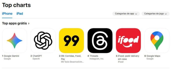 O sucesso do Gemini com Nano Banana não se resume ao Brasil, e o app da IA do Google também lidera o ranking dos mais baixados na App Store dos EUA, aparecendo também na segunda posição no Canadá e Reino Unido, de acordo com o site 9to5Mac.
