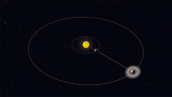 Saturno entra em oposição quase todos os anos, quando a Terra passa entre ele e o Sol. Nosso planeta leva um ano para dar a volta ao Sol, mas o gigante dos anéis precisa de 29,4 anos. Por isso, a Terra sempre percorre um trecho maior para alcançá-lo novamente. Esse descompasso faz com que as oposições de Saturno ocorram a cada 378 dias, cerca de duas semanas mais tarde em cada ano terrestre.