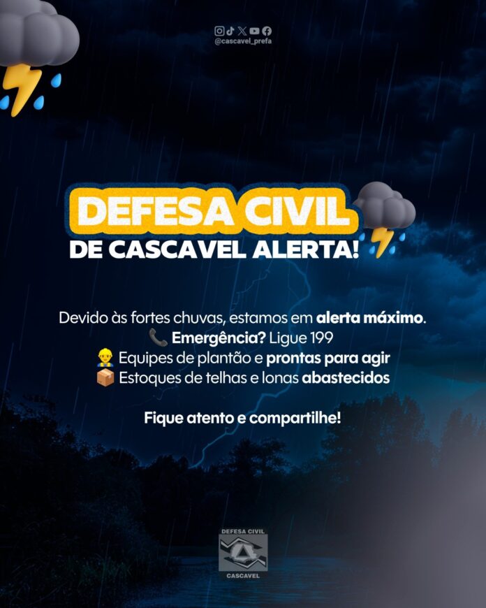 Devido às fortes chuvas e aos ventos intensos registrados nas últimas horas, a Defesa Civil de Cascavel permanece em plantão permanente para atender a comunidade em situações de emergência. O serviço pode ser acionado pelo telefone 199, disponível 24 horas por dia.