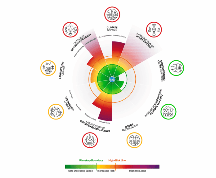 São eles: Mudanças Climáticas, Integridade da Biosfera, Mudanças no Sistema Terrestre, Uso de Água Doce, Fluxos Biogeoquímicos, Novas Entidades e, agora, a Acidificação dos Oceanos. Todas as categorias apresentam tendências de agravamento, deixando apenas a camada de ozônio e a carga de aerossóis (poluição do ar) dentro de limites seguros.