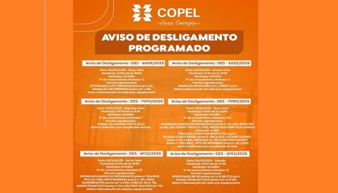 O Município de Guaíra, por meio da Secretaria de Administração (SEADM), informa que a Copel realizará desligamentos programados de energia elétrica entre os meses de setembro e outubro, para execução de serviços de melhorias, manutenções e ampliações na rede.