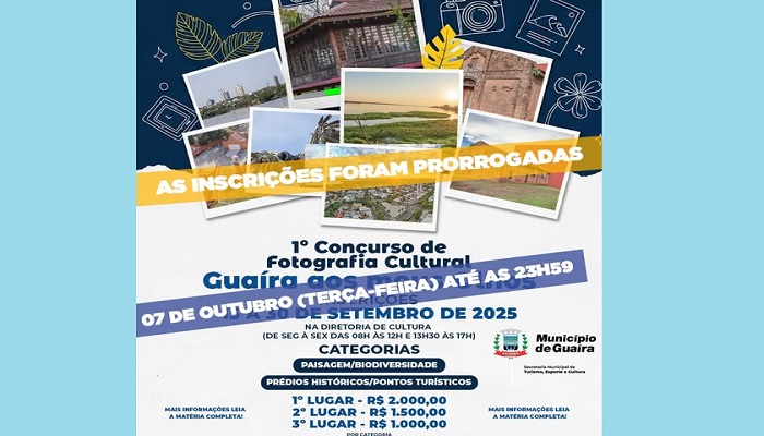O Município de Guaíra, por meio da Diretoria de Turismo da SEMTEC – Secretaria Municipal de Turismo, Esporte e Cultura, informa que atendeu a pedidos da população e prorrogou o prazo de inscrições para o Concurso de Fotografia.