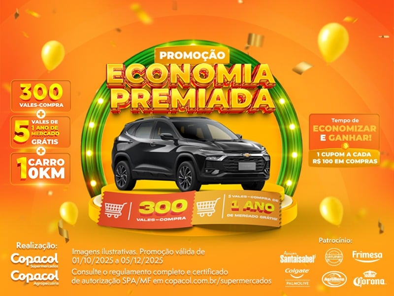 Em comemoração aos 62 anos de história, a Copacol realiza a promoção “Economia Premiada”, que vai presentear os clientes do Copacol Supermercados e das Lojas Agro. Entre os prêmios estão um Chevrolet Tracker 0 km, cinco vales-compra equivalentes a 1 ano de mercado grátis e 300 vales-compra de até R$ 1 mil.A cada R$ 100 em compras (até 5 de dezembro) os clientes recebem um cupom para participar da promoção e concorrer a todos os prêmios. Para validar a participação, basta responder corretamente à pergunta: “Em qual supermercado você tem a chance de ganhar um Chevrolet Tracker 0 km?”. “Estamos muito felizes em celebrar mais um aniversário ao lado de todos que fazem parte da nossa história. Ao completarmos 62 anos, queremos compartilhar essa conquista com momentos especiais. Por isso, a promoção foi criada para reconhecer e presentear os consumidores do Copacol Supermercados e das Lojas Agro“, destaca o diretor-presidente da Copacol, Valter Pitol.Sorteios e Prêmios da PromoçãoConforme o regulamento, serão realizados diversos sorteios até o fim do ano. Os prêmios principais – carro zero quilômetro e os vales-compra equivalentes a um ano de mercado grátis – serão sorteados no encerramento da promoção.A promoção “Economia Premiada” é realizada pela Copacol e conta com o patrocínio de grandes marcas parceiras: Açúcar Santaisabel, Frimesa, Colgate, Palmolive, Catupiry, Corona e Agrobona. Os consumidores podem participar realizando suas compras nas unidades do Copacol Supermercados e Lojas Agro localizadas em Cafelândia, Jotaesse, Nova Aurora, Jesuítas, Formosa do Oeste e Goioerê.Validade e RegulamentoA promoção é válida até 5 de dezembro de 2025. O regulamento completo e o certificado de autorização SPA/ME estão disponíveis no Portal: www.copacol.com.br/supermercadosO post Copacol lança promoção “Economia Premiada” na comemoração de 62 anos apareceu primeiro em O Paraná – Jornal de Fato.