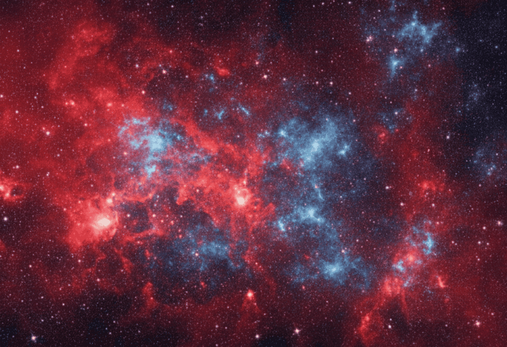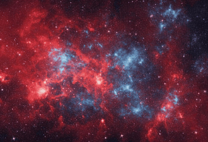 Representação artística da matéria escura reagindo em vermelho e em azul com o Universo. Crédito: Imagem gerada por IA/Gemini
