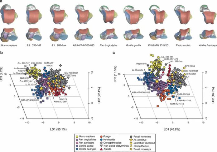 Modelos 3D do osso do tornozelo mostram diferenças entre humanos e grandes macacos. O fóssil analisado tem características intermediárias entre chimpanzés e hominídeos antigos. Crédito: Prang, TC, Tocheri, MW, Patel, BA et al.