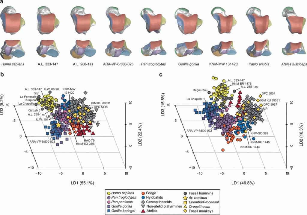 A análise do tálus comparou Ardi a dezenas de primatas antigos;