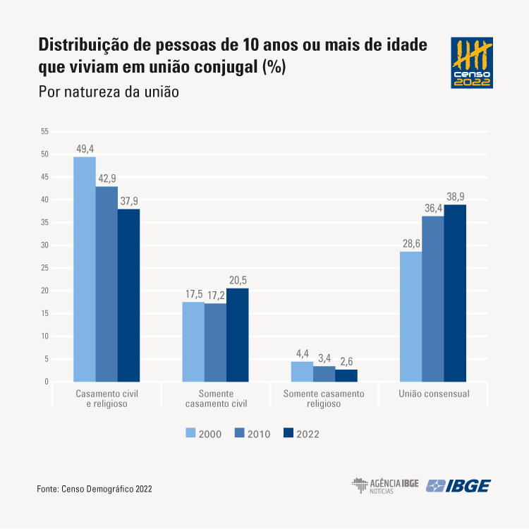 De 2000 a 2022, cresceram os casamentos somente no civil (17,5% para 20,5%) e as uniões consensuais (28,6% para 38,9%) e caíram os casamentos no civil e religioso (49,4% para 37,9%) e apenas no religioso (4,4% para 2,6%).