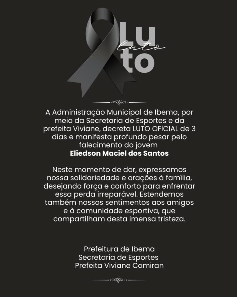 A Prefeitura de Ibema, na região Oeste do Paraná, decretou luto oficial de três dias pela morte trágica de Eliedson Maciel dos Santos, de 12 anos. A criança morreu na quinta (6) após ser atingida por uma trave de futebol em uma quadra municipal.