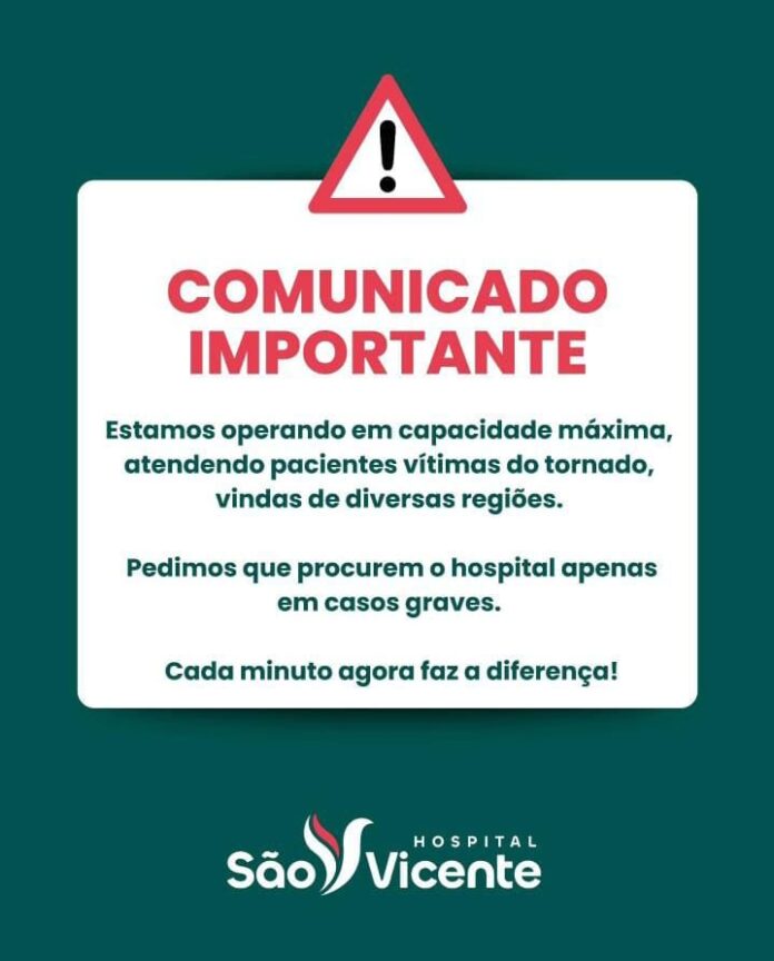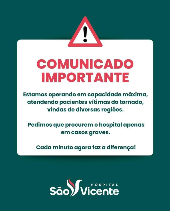 “Estamos operando em capacidade máxima, atendendo pacientes vítimas do tornado, vindas de diversas regiões. Pedimos que procurem o hospital apenas em casos graves. Cada minuto agora faz a diferença”, informou o Hospital São Vicente.