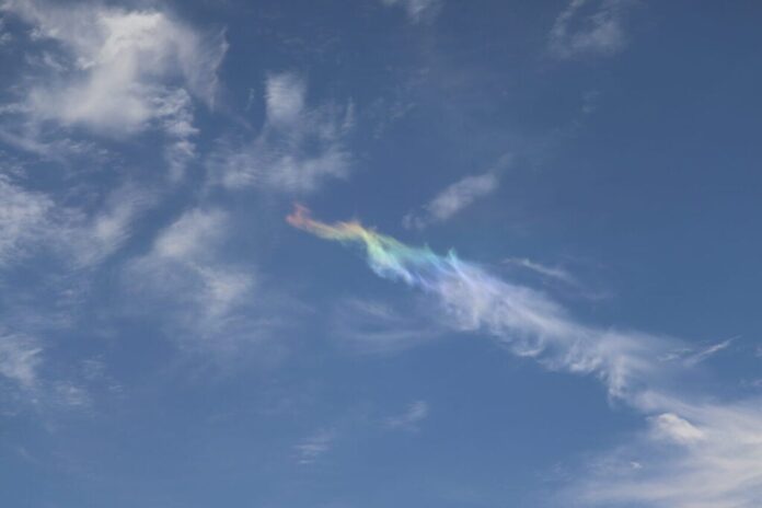 Uma nuvem iridescente é um fenômeno atmosférico raro e fascinante, também chamado de “nuvem arco-íris”.. Segundo o Simepar, o fenômeno da nuvem arco-íris ocorre quando a luz solar se dispersa em gotas de água ou cristais de gelo muito pequenos em nuvens altas. O efeito cria cores vibrantes como rosa, azul e verde, que aparecem em manchas ou anéis nas bordas da nuvem. O fenômeno é causado pela difração da luz, diferente do arco-íris tradicional, que é formado por refração e reflexão.