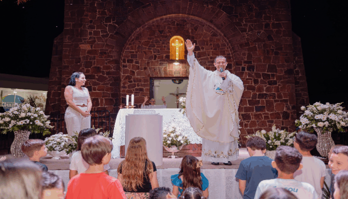 A celebração foi presidida pelo padre Jauri Strieder, pároco da Igreja Nossa Senhora dos Navegantes, que também abençoou os 74 anos de emancipação político-administrativa do Município de Guaíra, comemorados nesta sexta-feira, 14 de novembro. Durante a homilia, o padre destacou o papel da fé na formação cultural dos povos. “A cultura de um povo se revela em sua fé, e a arquitetura religiosa é o reflexo mais visível dessa devoção. Os templos contam histórias, revelam a alma das comunidades e são testemunhas silenciosas da passagem do tempo. Guaíra preserva essa herança com a beleza de sua Igrejinha de Pedra, símbolo da identidade e da fé do seu povo”.
