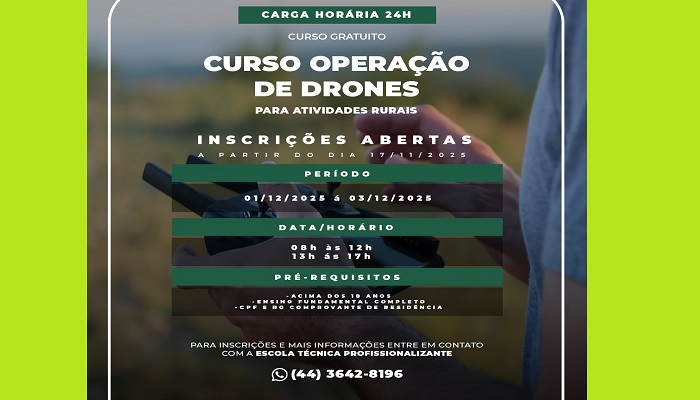 As inscrições começam no dia 17 de novembro de 2025, a partir das 7h30, na Escola Técnica Profissionalizante. O curso é gratuito, possui carga horária de 24 horas e será realizado nos dias 1º, 2 e 3 de dezembro de 2025, das 8h às 12h e das 13h às 17h.