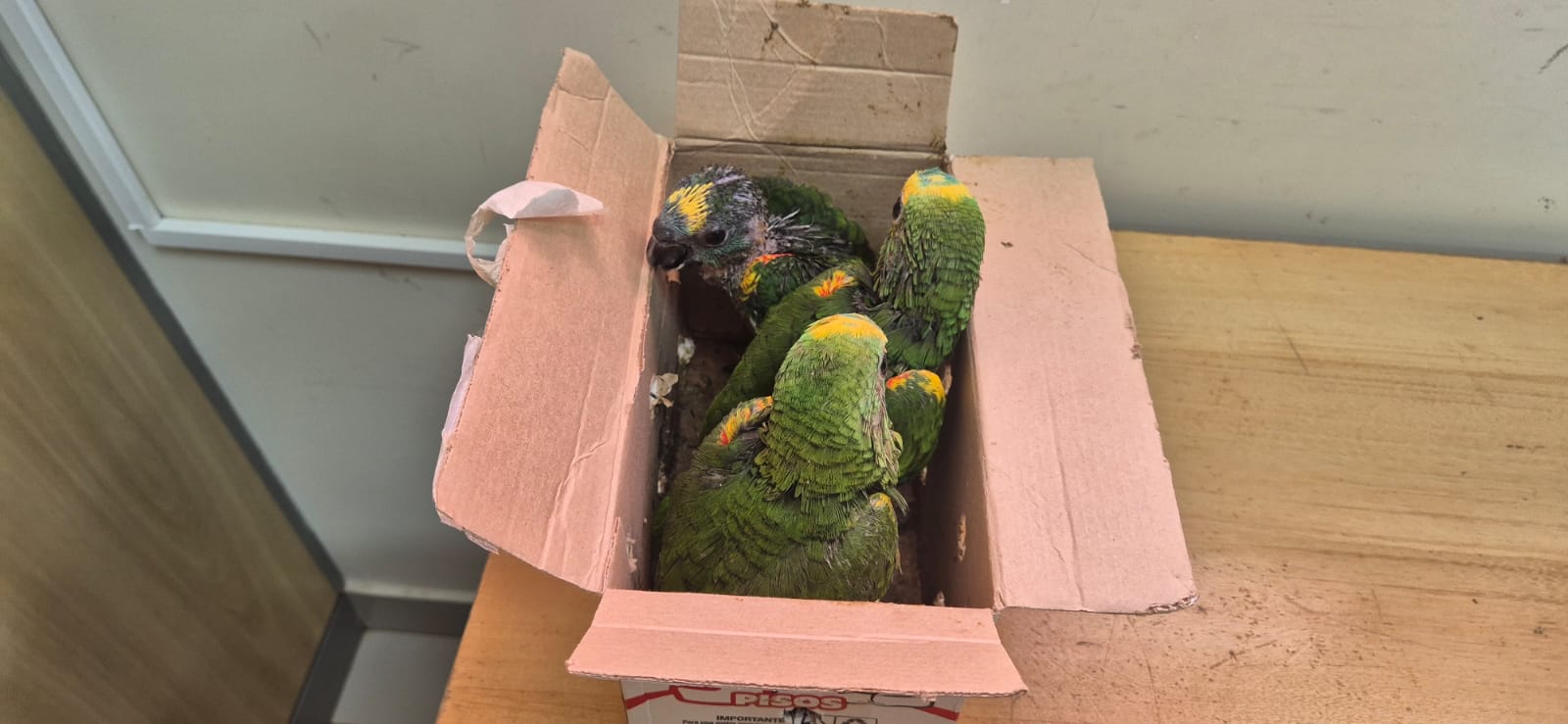 Ao verificar o conteúdo, foi encontrada uma caixa contendo três papagaios-verdadeiros, espécie nativa brasileira e frequentemente alvo de captura para comercialização ilegal. As aves estavam vivas, porém estavam debilitadas, reflexo do transporte inadequado.