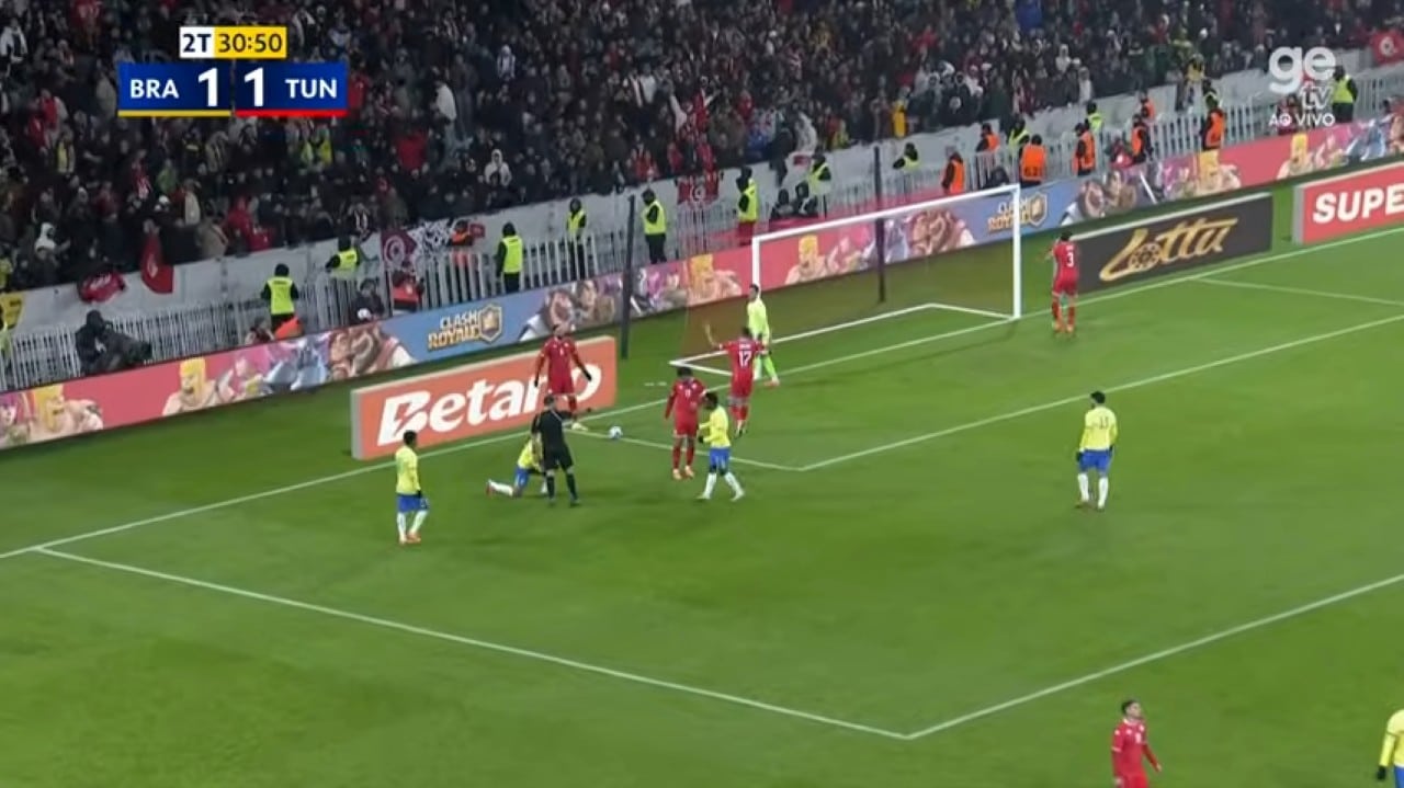 O primeiro gol brasileiro ocorreu também de pênalti, aos 43 minutos da primeira etapa. Após o árbitro revisar o lance no monitor, confirmou o toque na mão de Bronn na área, e Estêvão, com força, chutou no canto esquerdo, deslocando o goleiro e empatando o confronto. O tento foi importante para dar tranquilidade à Seleção, que havia sofrido o gol da Tunísia aos 22 minutos, com Mastouri aproveitando um erro defensivo. A partida tem se mantido com o placar de 1 a 1, mas a Seleção segue pressionando em busca da virada nos minutos finais.