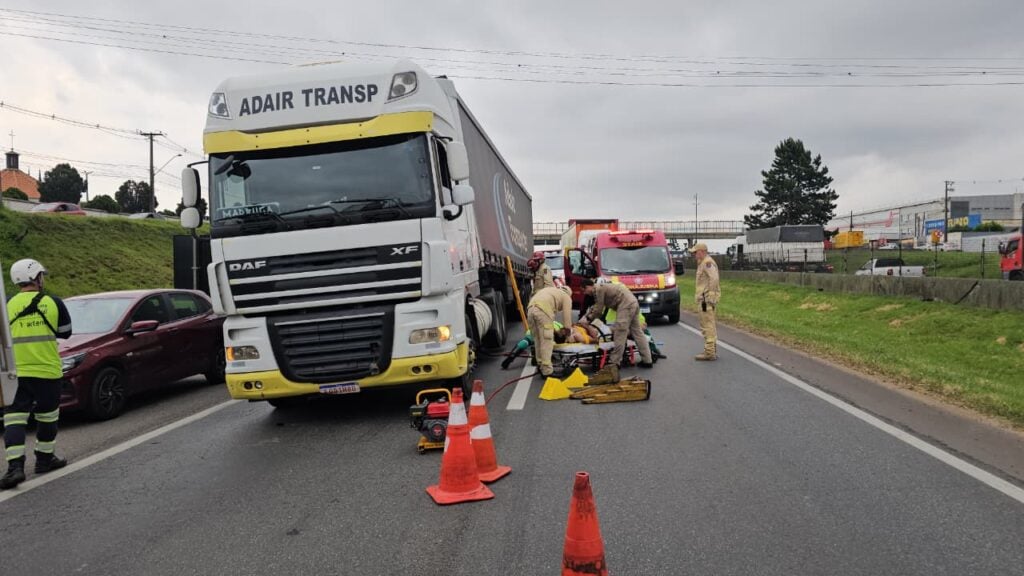 “Nisso a moto caiu e saiu rodando para fora da pista. Já o motociclista caiu para baixo da carreta que tentava ultrapassar. Ele ficou embaixo da carreta, dos rodados. Eles [socorristas] levantaram a carreta e tiraram o motociclista consciente. Ele está recebendo atendimento médico neste momento e ainda não se sabe qual seu estado de saúde”, informa Frigério.