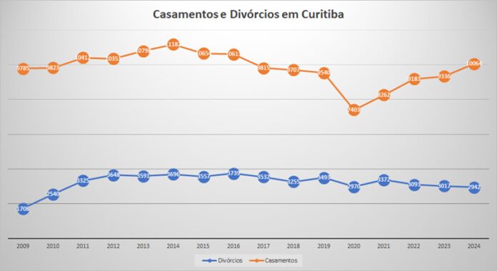 Os números mostram que o número de casamentos em Curitiba cresceu 7,8% entre 2023 e 2024, tendo ocorrido 10.064 matrimônios no ano passado. Já o de divórcios diminuiu 2,49% no mesmo período. O Instituto Brasileiro de Geografia e Estatística (IBGE) divulgou na última quarta, 10, os dados das Estatísticas do Registro Civil.