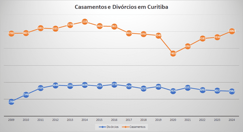 Quanto aos divórcios, houve uma diminuição de 2,49% entre 2023 e 2024 no município. Na série histórica, esta diminuição tem sido constante desde 2021. As capitais que apresentaram aumento mais expressivo no número de divórcios foram Rio Branco (AC), com 13,28%, Fortaleza (CE), com 4,86%, e Rio de Janeiro (RJ), com 1,90%.