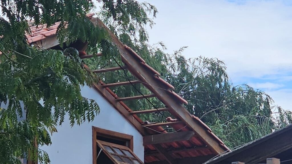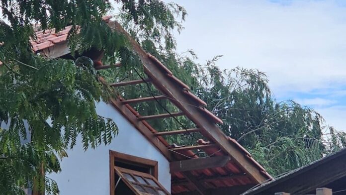 Uma forte e rápida rajada de vento derrubou várias árvores e destelhou casas no bairro Capão Raso, em Curitiba, no início da tarde deste domingo (14).