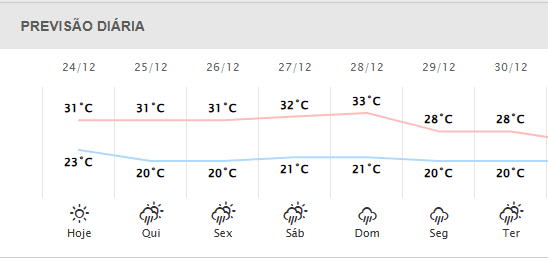 A previsão, inclusive, é que a partir desta quinta-feira, 25 de dezembro, Curitiba volte a registrar precipitações mais frequentes, especialmente durante as tardes e as noites. A temperatura deve seguir elevada na cidade nos próximos dias, com máxima acima dos 30ºC, na quinta (25), na sexta (26) e no sábado (27) há previsão de pancadas de chuva na cidade. Já no domingo (28) e na segunda (29) estão previstas chuvas mais expressivas, com maior volume.