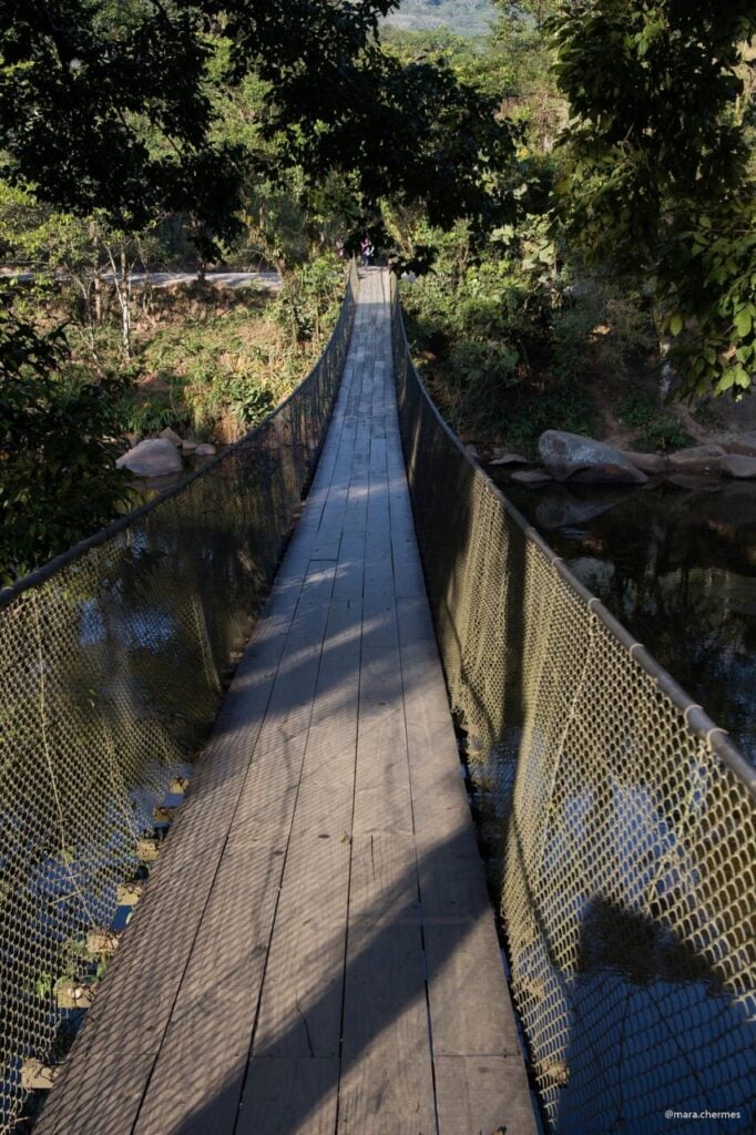 A ponte suspensa fica próxima à outra atração do local, mas se diferencia completamente por estar elevada e não permitir a passagem de veículos.