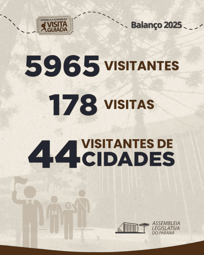 O Programa de Visitas Guiadas à Assembleia Legislativa do Paraná teve grande sucesso em 2025, recebendo 5.965 participantes, um aumento de 23% em relação aos 4.834 visitantes em 2024. Ao longo de 178 visitas, grupos de diversas regiões do Paraná, além de alguns de fora do Brasil, conheceram as dependências e o funcionamento da Casa de Leis.