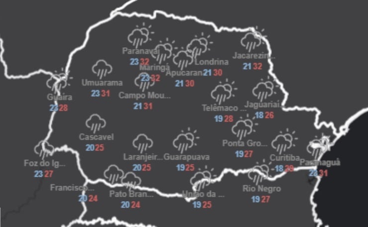 No sábado, há previsão de temporais, chuva intensa, rajadas de vento, raios e eventual granizo em várias regiões. Essa instabilidade deve ser verificad pela manhã nas regiões Oeste, Sudoeste e Sul do Paraná. As regiões Norte e Leste devem ter temporais à tarde e à noite de sábado.
