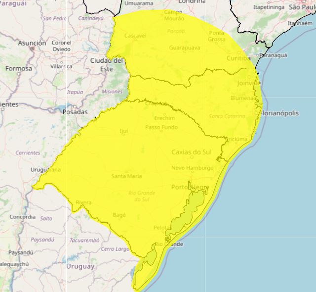 O alerta pontua risco à saúde (veja no final da matéria) por conta de um rápido declínio de temperaturas válido até as 18 horas deste domingo. O aviso, bem no meio do verão, é válido para o Sul do Brasil. Em Curitiba, por exemplo, a máxima de domingo, não deve passar dos 23ºC, segundo o Simepar.