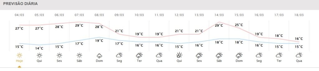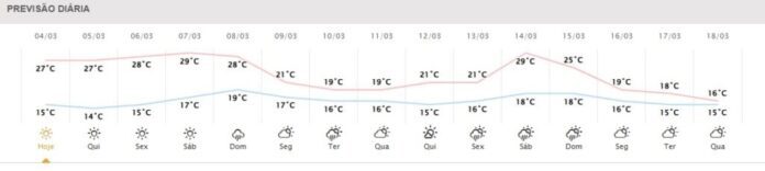 O sábado em Curitiba pode ter muito calor, e termômetros em 30°C. No domingo chove, mas ainda faz calor de tarde. Ao longo da próxima semana Curitiba deve ter dias mais amenos.